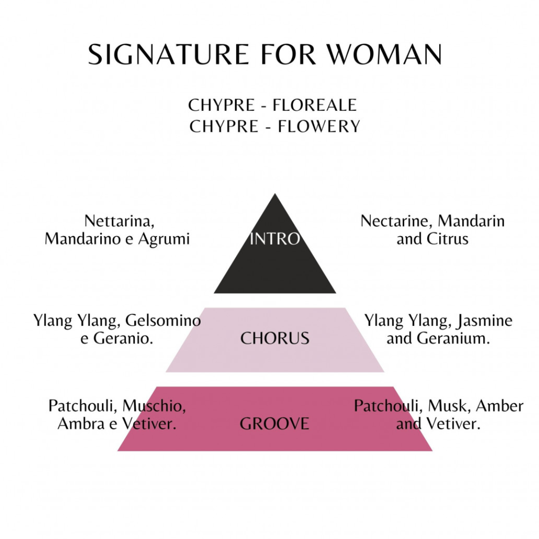 Con il suo design innovativo, Replay Signature punta a trasporre lo spirito della collezione moda Replay nel mondo della profumeria. La forma istituzionale della bottiglia si arricchisce grazie alle borchie su entrambi i lati. Il motivo floreale decora l’intera bottiglia rendendola estremamente elegante. La fragranza è una caratteristica composizione chypre con una femminilità moderna e un potere seducente. Nella nota di testa, gli agrumi diffondono il loro aroma per creare una sensazione di freschezza naturale. L’aria è profumata di mandarino dolce e nettarina succosa. L’incantevole nota di cuore unisce un bouquet di sensuale geranio, narcotico gelsomino ed esotico ylang ylang che fondono le loro sfaccettature carnali e diffondono puro fascino. L’elegante base di vetiver scuro, patchouli terroso, preziosa ambra e puro muschio armonizzano questo eccezionale capolavoro.