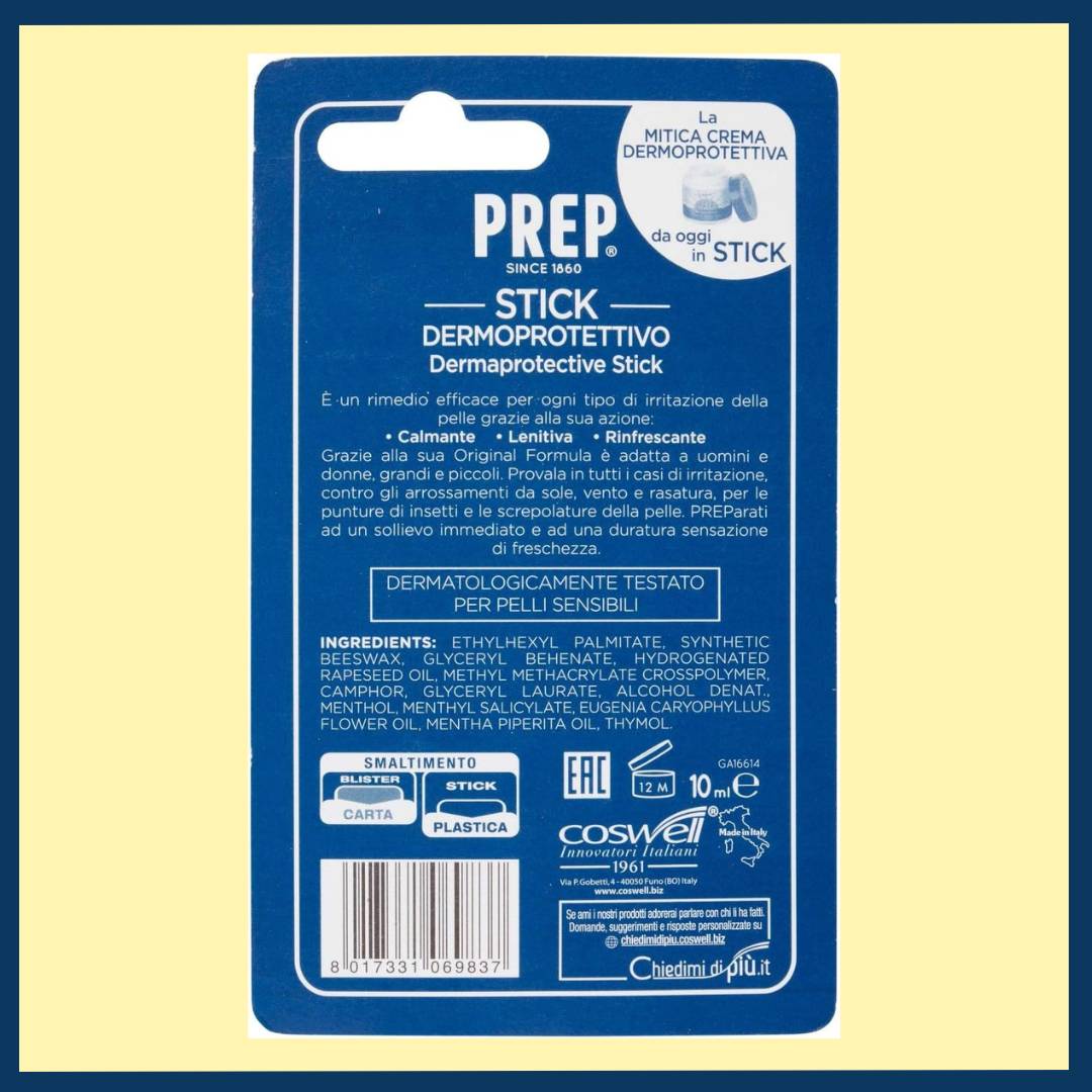 Lo Stick Dermoprotettivo Prep è il rimedio multifunzione ideale per ogni tipo di irritazione cutanea. La sua formula è studiata per donare sollievo immediato grazie all’effetto calmante, lenitivo e rinfrescante. Pratico da portare sempre con sé, è perfetto per l’uso quotidiano e per tutta la famiglia.