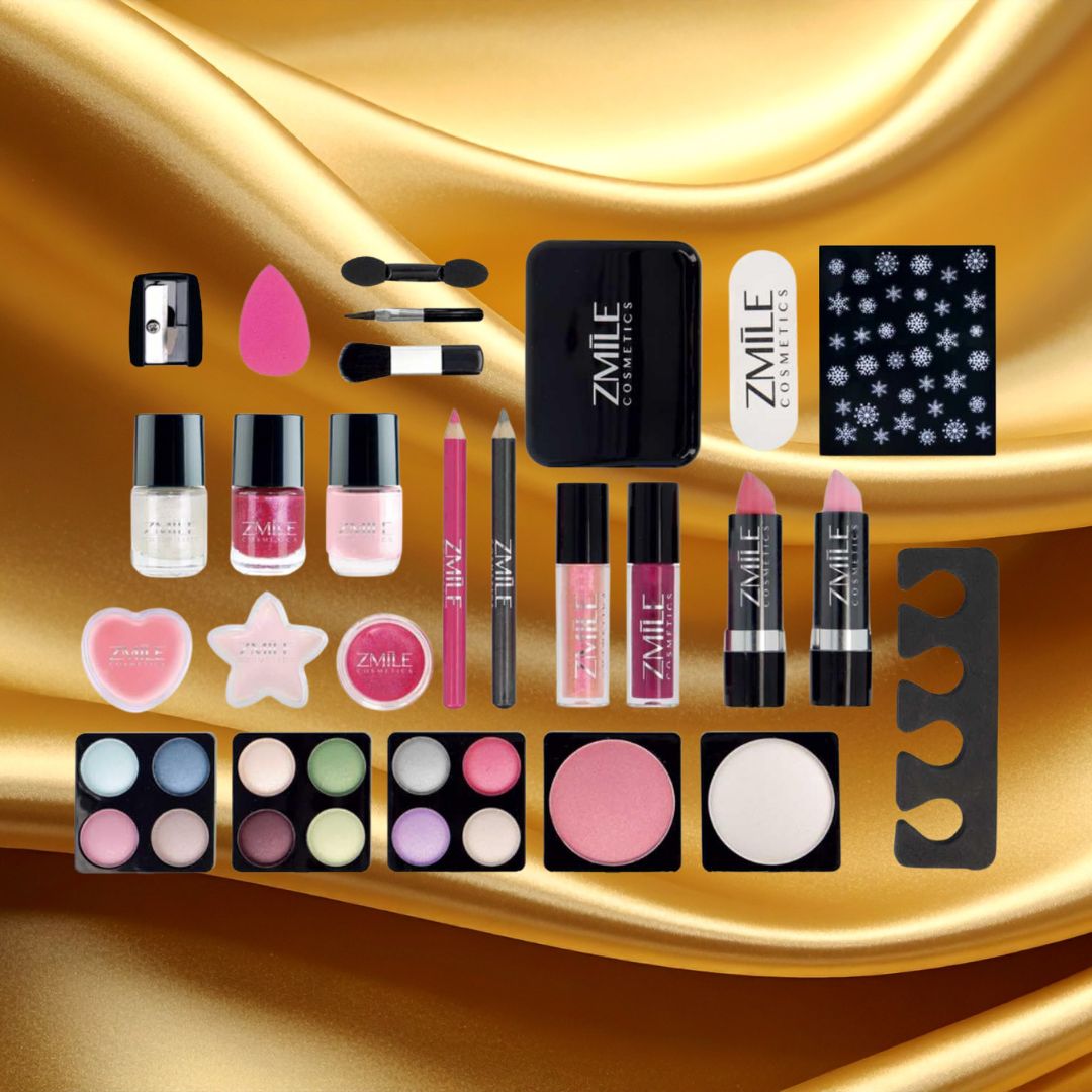 ombretti, smalti per unghie, smalto glitter, lucidalabbra in crema, rossetti, lucidalabbra, kajal, matita labbra, mini blender make-up, set pennelli e applicatori, temperino, adesivi unghie fiocchi di neve, lima per unghie, specchietto, spingicuticole