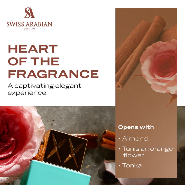 L’apertura si illumina con la cremosità della mandorla, preludio a un cuore ricco e avvolgente dove la rosa turca, il fiore d’arancio tunisino e la corteccia di cannella creano una sinfonia seducente e calda.